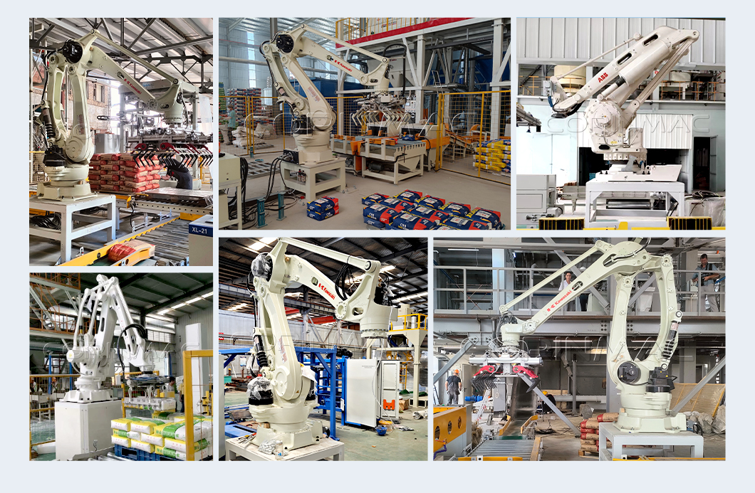 Наш завод поставляет такой автоматический робот паллетоукладчик для клапанных мешков сухих смесей .