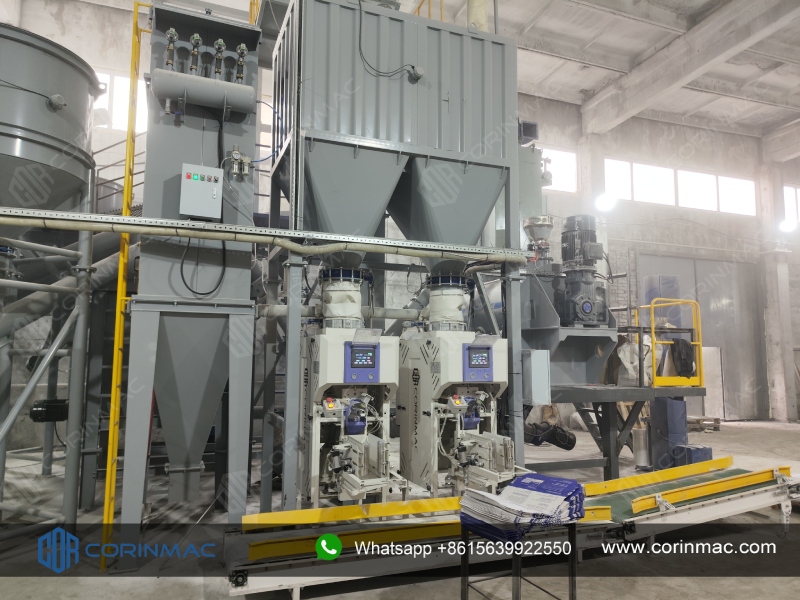Автоматизированная система упаковки и паллетирования: объединяя двухстанционную упаковочную машину для клапанных мешков, конвейерную линию и вспомогательное паллетирующее оборудование, она обеспечивает автоматическое дозирование, наполнение, запечатывание и паллетирование готового строительного раствора, достигая бесшовной интеграции процессов «упаковка-паллетирование».