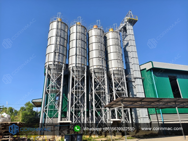 Склад сырья: Большие вертикальные силосы обеспечивают точное хранение и автоматизированную подачу, гарантируя стабильную поставку сырья.